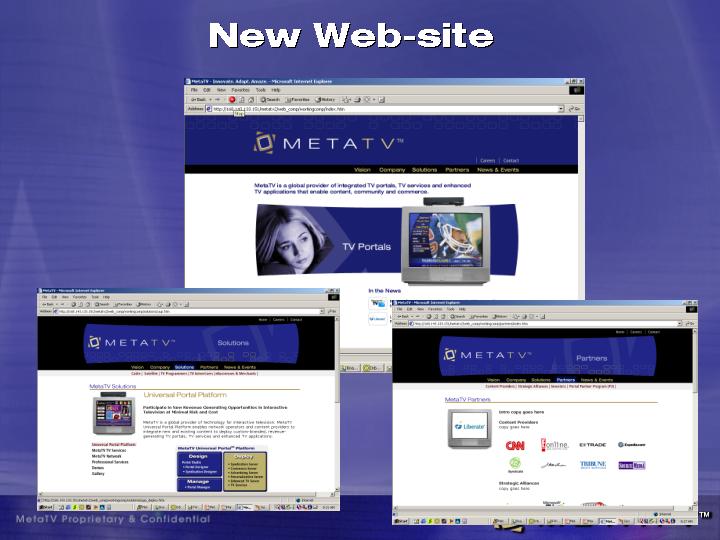 MetaTV was established in March 1999 to develop software that formed a platform that would enable the deployment and management of iTV applications, services and content. In June 2000, the company began to make their presence felt through a relentless marketing campaign that has so far yielded significant results as measured by customer acquisition and satisfaction, press and analyst coverage, overall industry brand awareness delivered under cost and budget. The campaign continues to this day and in an ongoing effort to strengthen our brand leadership.