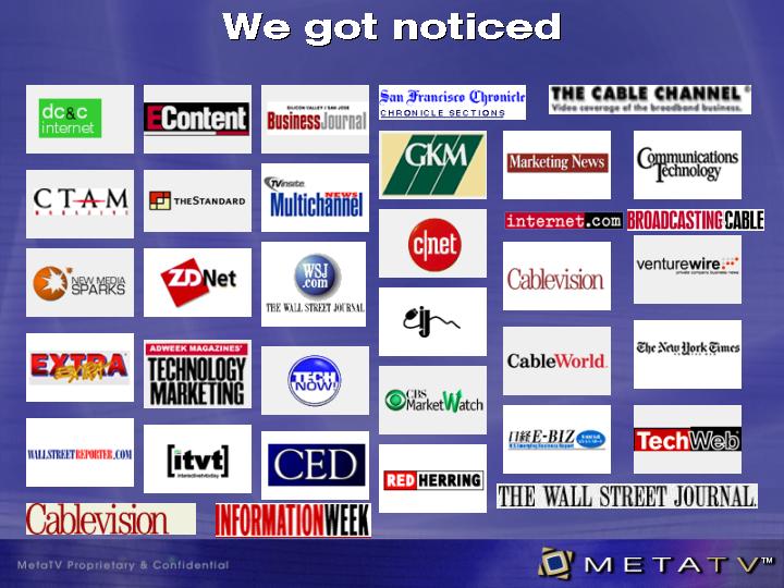 To date, MetaTV has successfully developed relationships with all of the major analysts that cover iTV (Forrester, Jupiter, Gartner, Yankee). In addition, MetaTV has been featured in over 50+ magazines, newspaper articles and video/TV programs. http://www.metatv.com/news/inthenews.htm